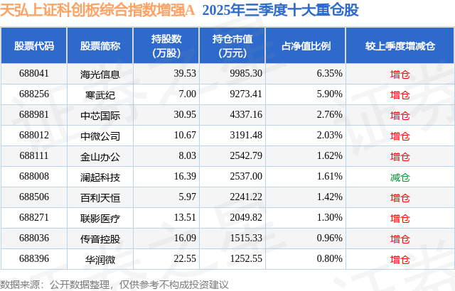 根据2025基金Q3季报公募基金重仓股数据,重仓该股的公募基金共6家,其中持有数量最多的公募基金为天弘基金的天弘上证科创板综合指数增强A。天弘上证科创板综合指数增强A目前规模为11.12亿元,最新净值1.371(12月9日),较上一交易日下跌0.17%。该公募基金现任基金经理为林心龙。林心龙在任的基金产品包括:天弘创业板ETF联接A,管理时间为2022年5月25日至今,期间收益率为39.7%;天弘中证计算机ETF联接A,管理时间为2022年5月25日至今,期间收益率为39.43%;天弘创业板ETF,管理时间为2022年5月25日至今,期间收益率为41.32%;天弘中证计算机ETF,管理时间为2022年5月25日至今,期间收益率为42.54%。
