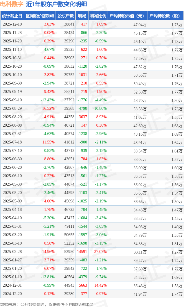 从股价来看,2025年11月28日至2025年12月10日,电科数字区间涨幅为3.03%,在此期间股东户数增加417.0户,增幅为1.09%。