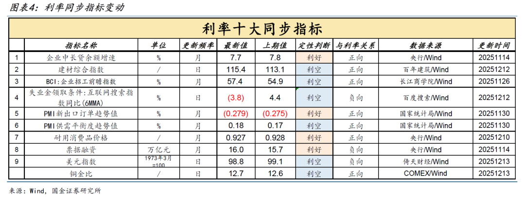 本周(12月7日至12月13日),利率十大同步指标释放的信号以“利空”为主,占比6/10;较上周维持一致。