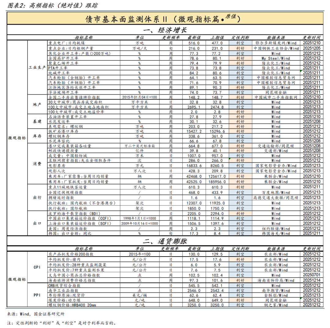 本周(12月7日至12月13日),国金证券固收基本面监测体系中,共有48个高频指标更新。其中我们对绝对值指标计算当月同比,对百分比指标计算月均值,然后针对债市做定性判断。结果显示:总体上,“利好”与“利空”指标个数分别为26个与22个。其中,“利好”主要体现在耗煤、粗钢产量、多数行业开工率、土地成交量价、工业品需求、消费(快递、票房、车市)、出行、出口、旅游消费价格等方面,“利空”主要体现在商品房成交量价、消费(集装箱吞吐量、轻纺成交、失业金搜索)、多数农产品价格、及多数工业品价格等方面。