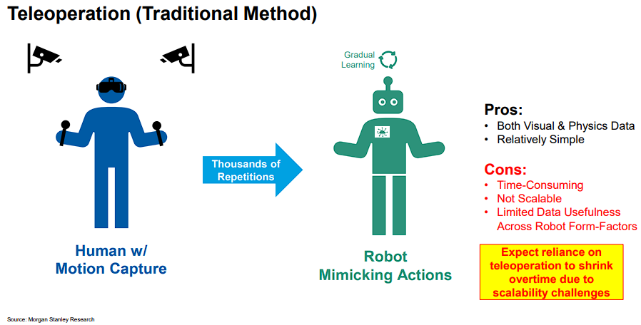 远程操作(Teleoperation):人类通过动作捕捉控制机器人,使其模仿行为。但该方法耗时、扩展性差,未来或逐步被替代。