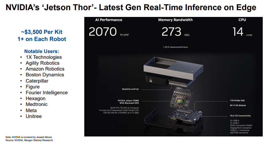 摩根士丹利预测,到2050年全球将售出14亿台机器人,这将推动边缘AI算力需求达到数百万个B200芯片当量,重塑全球计算基础设施的分布格局。