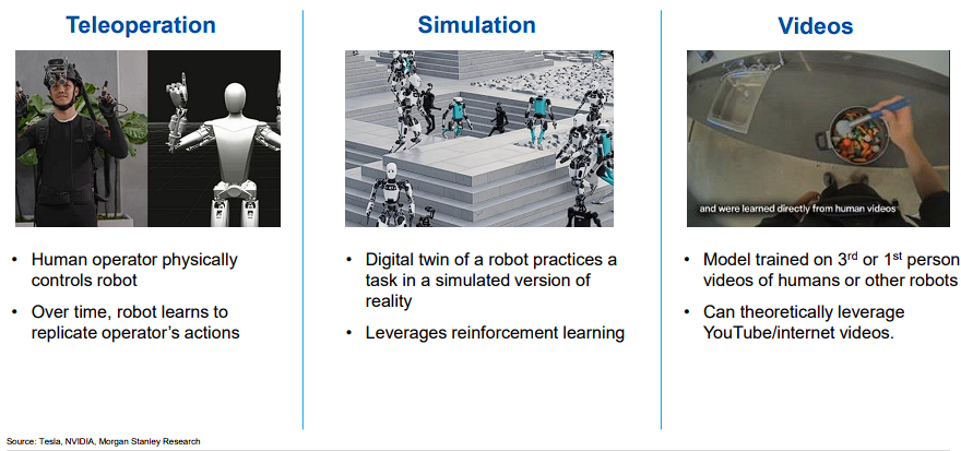 该行指出,特斯拉、英伟达、谷歌等科技巨头正在通过远程操作、模拟训练和视频学习三种主要方式收集训练数据。