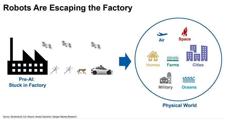大摩指出,AI赋能的新一代机器人正突破这一限制,开始进入家庭、农场、城市街道、深海甚至太空——例如自动驾驶汽车在拥挤路段导航、服务机器人在家庭中抓取物体、无人机在复杂地形巡检。
