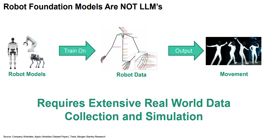 据大摩研究,与大语言模型主要训练文本和图像数据不同,机器人模型需要大量真实世界的物理操作数据,这使得数据收集和模型训练变得更加复杂且昂贵。