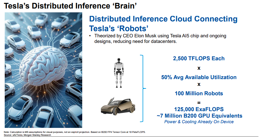 特斯拉提出“机器人即算力节点”的构想:若全球部署1亿台具备2500 TFLOPS算力的机器人,50%利用率下可提供125000 ExaFLOPS算力,相当于700万颗NVIDIA B200 GPU(单颗18 PetaFLOPS)。这种分布式模式不仅降低对数据中心的依赖,还能通过机器人间协同提升整体效率。