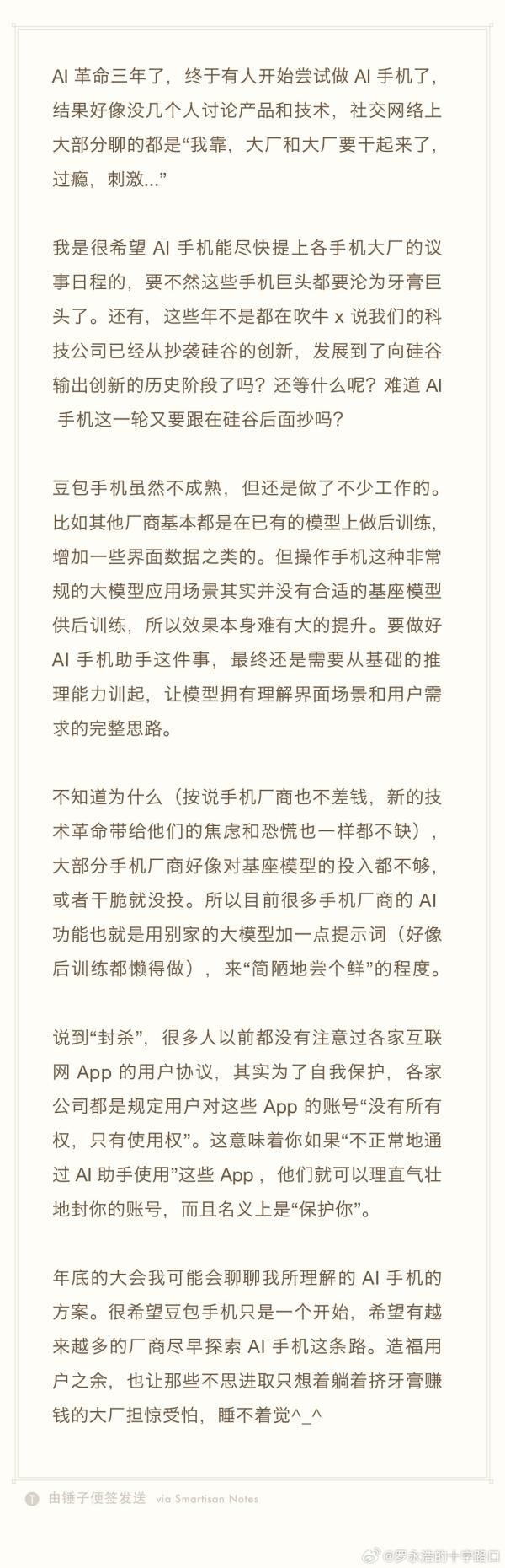 罗永浩坦言不解:手机厂商既不缺资金,也不乏技术焦虑,却鲜有对基座模型进行实质性投入。“目前很多所谓的AI功能,不过是调用第三方大模型,加几条提示词,连后训练都省了,只能算‘简陋尝鲜’。”