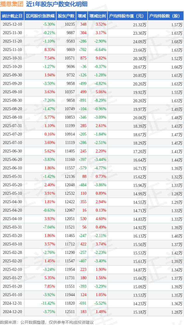 从股价来看,2025年11月30日至2025年12月10日,播恩集团区间跌幅为5.3%,在此期间股东户数增加348.0户,增幅为3.52%。