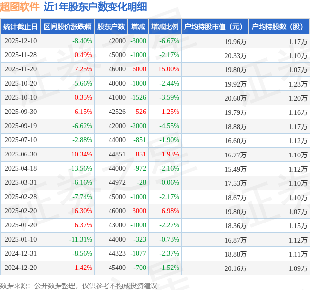 证券之星消息,近日超图软件披露,截至2025年12月10日公司股东户数为4.2万户,较11月28日减少3000.0户,减幅为6.67%。户均持股数量由上期的1.1万股增加至1.17万股,户均持股市值为19.96万元。