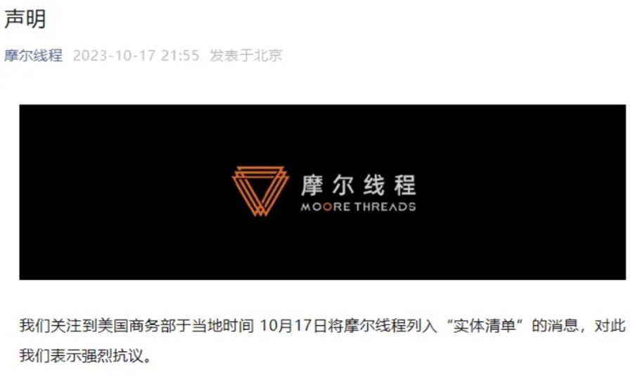 2023年10月,正值摩尔线程筹备发布第三代“曲院”架构产品之际。美国商务部工业与安全局(BIS)将摩尔线程列入出口管制实体清单。