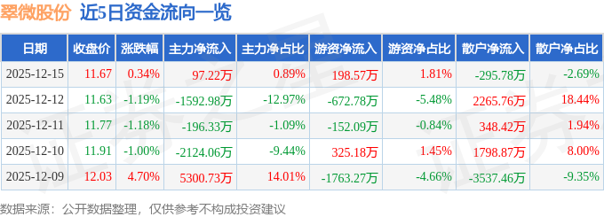 12月15日的资金流向数据方面,主力资金净流入97.22万元,占总成交额0.89%,游资资金净流入198.57万元,占总成交额1.81%,散户资金净流出295.78万元,占总成交额2.69%。