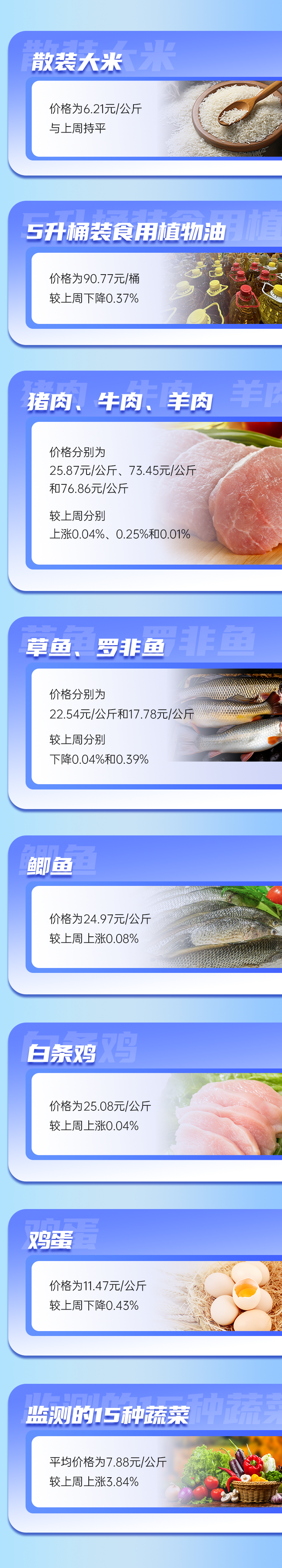 从云南省发展和改革委员会重要民生商品零售价格监测数据看,与上周相比,本周全省粮、油、肉、蛋、菜价格(全省平均价格,下同)总体平稳。信息员:蒲嘉设计:慈曾琪编辑:李楠 海量资讯、精准解读,尽在新浪财经APP