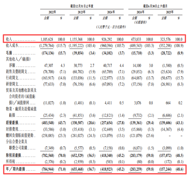 招股说明书显示,2022年、2023年、2024年以及2025年上半年,公司的净亏损分别为7.85亿元、6.55亿元、4.19亿元及1.57亿元。
