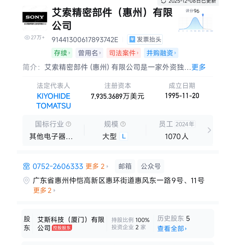 公开资料显示,索尼精密部件(惠州)有限公司(SPDH)成立于1996年,是索尼在华南地区的首家独资企业,主要生产光学拾音头等电子元件,巅峰期员工超3万人。
