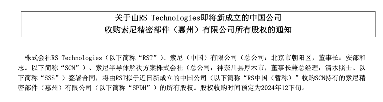 根据公开消息,2024年10月23日,日本RS株式会社(以下简称“RST”)披露公告,RST近日在中国新成立的RS中国收购索尼(中国)有限公司持有的索尼精密部件(惠州)有限公司(以下简称“ SPDH”)的所有股权,股权收购时间预定为2024年12月下旬。