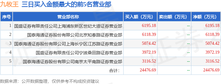 从龙虎榜公布的三日买卖数据来看,章盟主、宁波桑田路、作手新一等知名游资榜上有名。(知名游资章盟主一般指国泰海通证券股份有限公司上海长宁区江苏路证券营业部席位、知名游资宁波桑田路一般指国盛证券有限责任公司宁波桑田路证券营业部席位、知名游资作手新一一般指国泰海通证券股份有限公司南京太平南路证券营业部席位、知名游资章盟主一般指国泰海通证券股份有限公司上海浦东新区海阳西路证券营业部席位,根据市场资料整理,仅供参考)