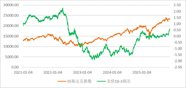 图为美债长短端利差和纳斯达克指数收盘价走势对比