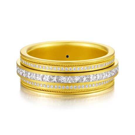 在设计上,“时来运转”汲取帝王扳指的造型灵感,以回纹方与公主方宝石象征循环不息的好运,阶梯型结构寓意身份与地位的不断攀升。9层美光圈环绕指间,如光晕层层绽放;一宝双戴的设计,兼顾日常与场合佩戴的多样可能;360度镶嵌宝石与钻石,即使在内壁也以黑白钻石点缀,象征昼夜守护、好运不息。