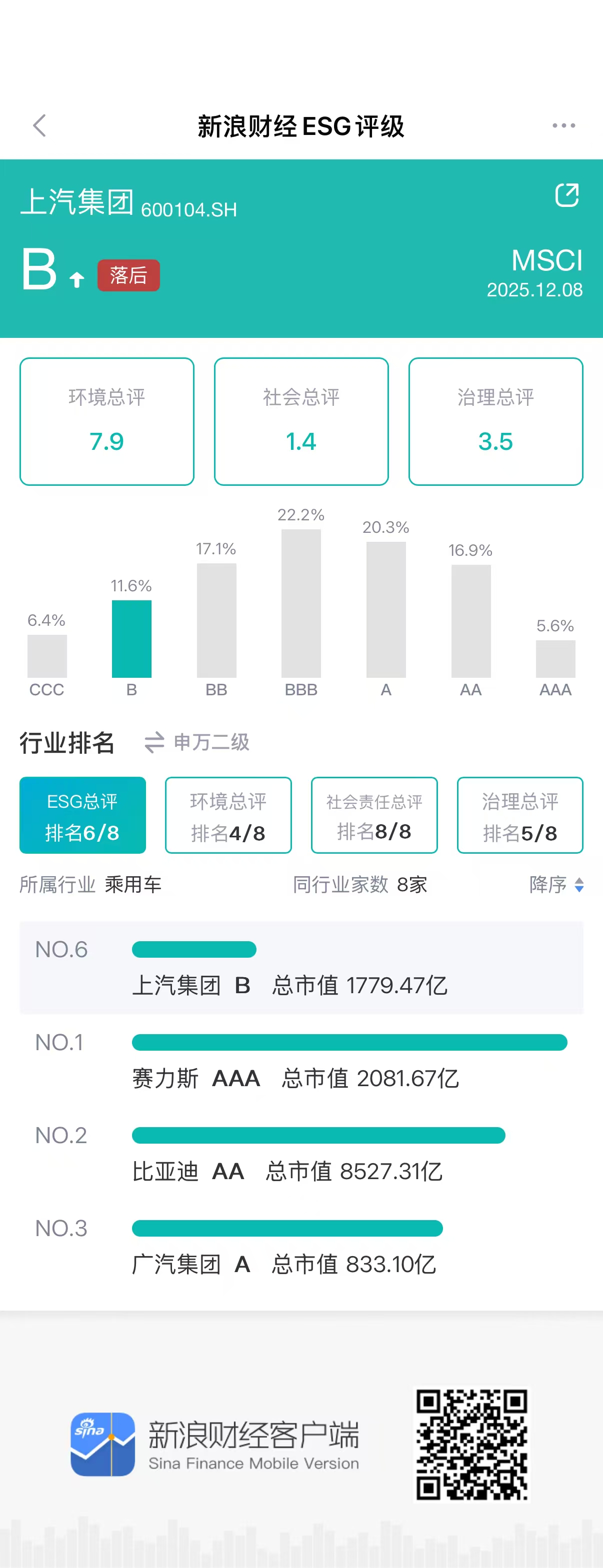 在新浪财经ESG评级查询平台可以查询到荣威母公司上汽集团的ESG评级评分,国际知名评级机构给上汽集团的ESG表现打出的评级为B(落后)在乘用车行业8家企业中排名第6,其中社会总评仅为1.4,在同行业企业中排名垫底,治理总评仅为3.5,普遍偏低,说明上汽集团还需要在社会责任的履行方面加大投入。