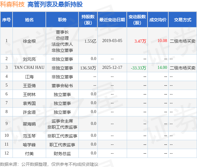 科森科技近半年内的董监高及核心技术人员增减持详情如下: