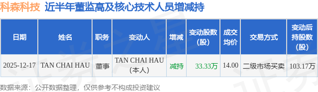 证券之星消息,根据12月17日市场公开信息、上市公司公告及交易所披露数据整理,科森科技(603626)最新董监高及相关人员股份变动情况:2025年12月17日公司董事TAN CHAI HAU共减持公司股份33.33万股,占公司总股本为0.0601%。变动期间公司股价上涨6.97%,12月17日当日收盘报14.11元。