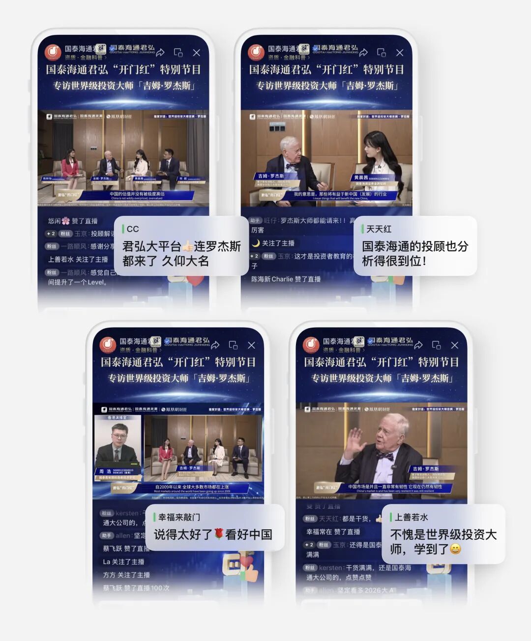 吉姆·罗杰斯与巴菲特、索罗斯并列为“三大投资家”,作为量子基金联合创始人,他曾创造10年4200%的投资组合收益成绩。尤为值得关注的是,罗杰斯是最早大举押注中国市场的外国投资者之一,曾多次公开表态长期看好中国资本市场。本次特别直播在国泰海通君弘App、国泰海通灵犀App、凤凰网财经等十余平台播出。罗杰斯在节目中再次明确表示,他始终持有中国资产并持续看好中国的资本市场。