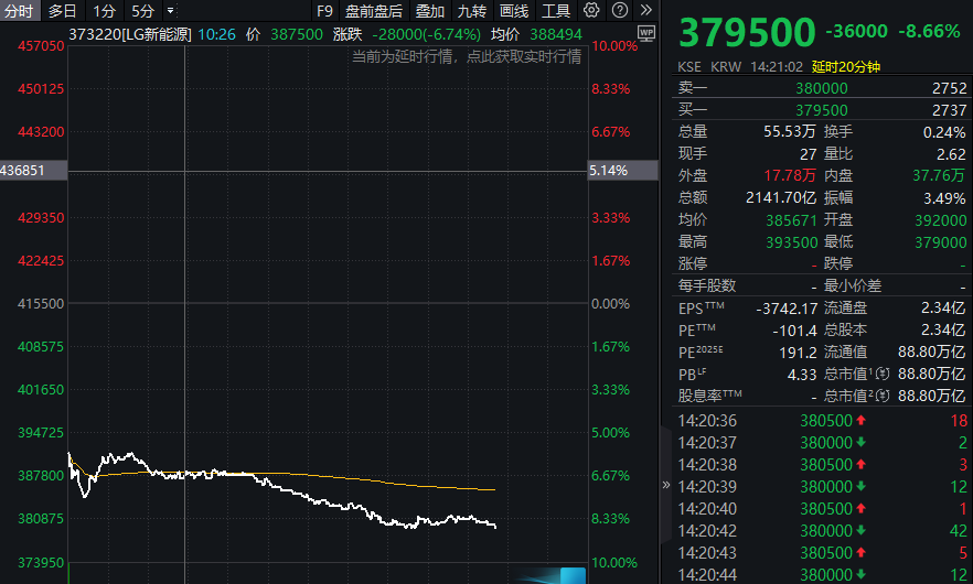 12月18日盘中,韩国动力电池龙头企业LG新能源的股价大幅跳水。截至当地时间14时20分,该公司股价跌幅超过8%,单日市值蒸发超8万亿韩元(约合人民币380亿元)。