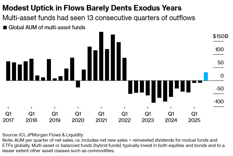 尤其是散户投资者们,多年来一直在撤离平衡型与多元化基金。摩根大通的上述统计数据显示,该类别——包括公开发行的风险平价类基金与60/40组合ETF(传统上配置60%股票、40%债券)——在今年秋季出现小幅反弹之前,已连续13个季度录得资金净流出。尽管资金仍持续流入纯债基金与纯股基金,但“中间地带”——一种传统的多元化策略,仍不受青睐。