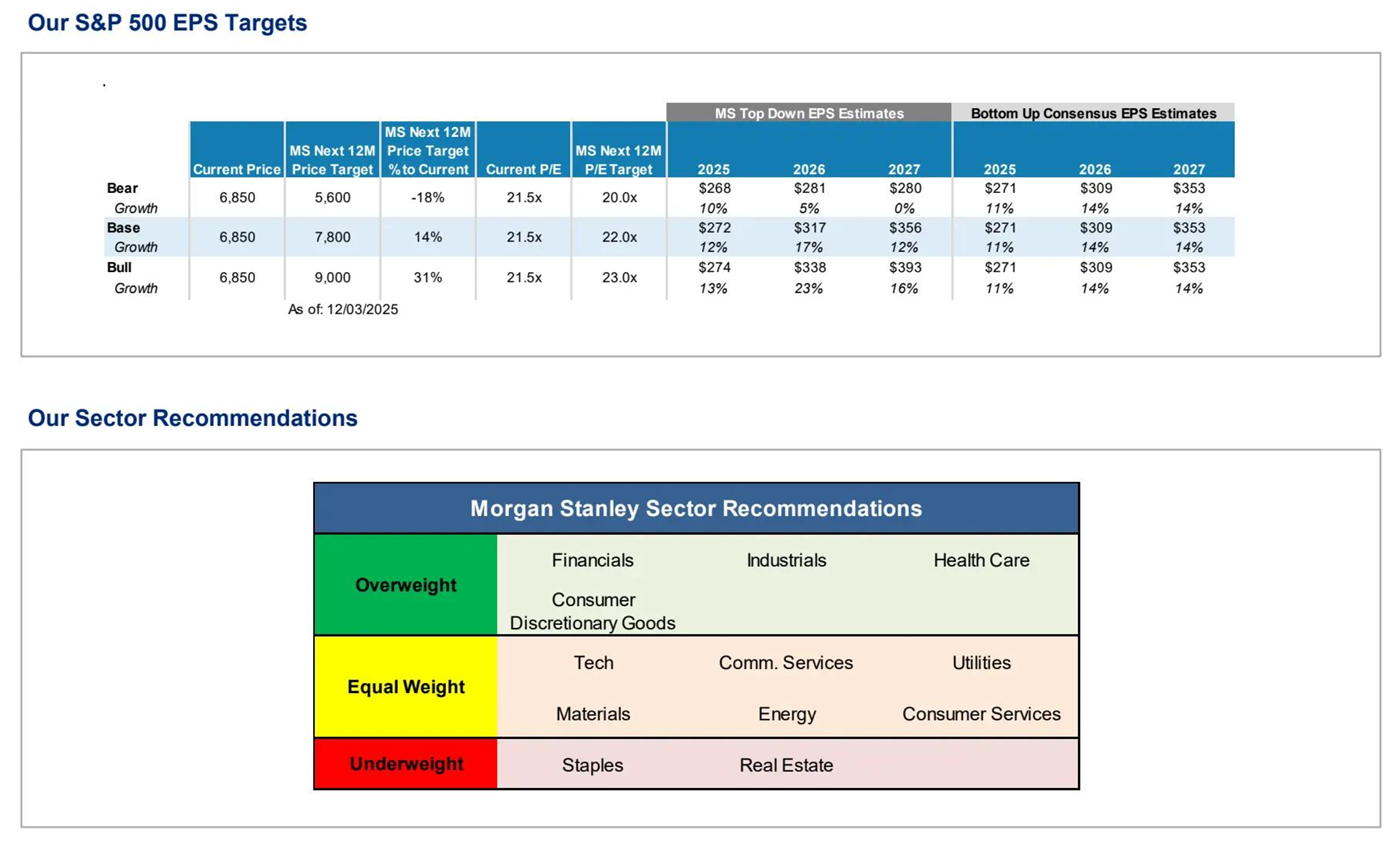 因此,大摩将2026年界定为“滚动复苏下的广谱股票市场牛市”,押注标普500指数有望冲击9000点位,并且主张“由点及面”的市场风险偏好回归与多个周期性的行业共振上行。