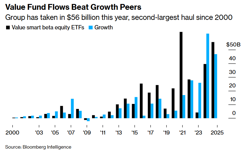 然而在表象之下,全年大部分时间里市场的“广度”一直在扩张——凸显出资金开始从受益于AI的热门AI科技股向其他板块轮动。偏价值的股票ETF——其中许多回避了权重过高的大型科技板块——今年吸引了超过560亿美元资金流入,为至少自2000年以来第二大的年度净流入规模。