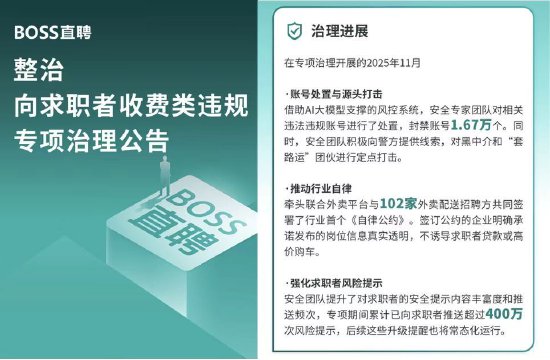 2025年11月,BOSS直聘共处置涉收费类违规违法账号1.67万个,向求职者推送超过400万次风险提示信息。同时,BOSS直聘联合外卖平台,组织102家外卖配送企业共同签署了外卖配送领域的首个自律公约。这些企业共同承诺,岗位真实透明、不诱导贷款购车、不收取不合理费用、遵守平台管理规范。
