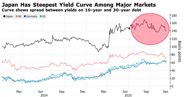 12月初,日本长期债券收益率达到多年高位,表明投资者需求疲软,原因是担心日本政府支出增加以及12月19日可能加息。规模达7.5万亿美元的日本债券市场通常较为稳定,但近几个月来却经历了异常剧烈的波动,其中包括几次反响平平的政府债券拍卖。这场动荡始于5月份,当时20年期日本国债拍卖反响不佳,导致收益率飙升。当月晚些时候的40年期日本国债拍卖更是加剧了市场的动荡。