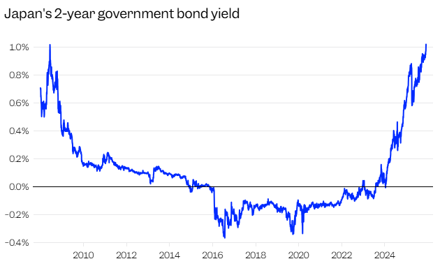 例如,2024年8月,当时日本国债收益率飙升,市场波动性也随之急剧增加。这给那些进行“日元套利交易”的投资者带来了困境。这类交易是指以低利率借入日元,然后将其兑换成美元投资于美国资产,例如股票。当日本利率上升时,投资者可能被迫平仓以应对更高的借贷成本。