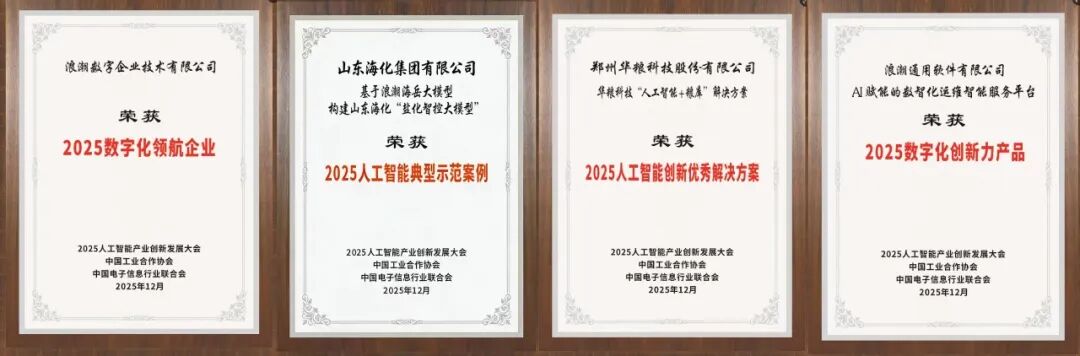 凭借在数智化转型方面的卓越实践,浪潮数字企业成功获评“2025数字化领航企业”,同时,浪潮数字企业旗下华粮科技“人工智能+粮库”解决方案获评“2025人工智能创新优秀解决方案”,浪潮数字企业AI赋能的数智化运维智能服务平台获评“2025数字化创新力产品”,基于浪潮海岳大模型构建山东海化(000822)“盐化工智控大模型”获评“2025人工智能典型示范案例”。
