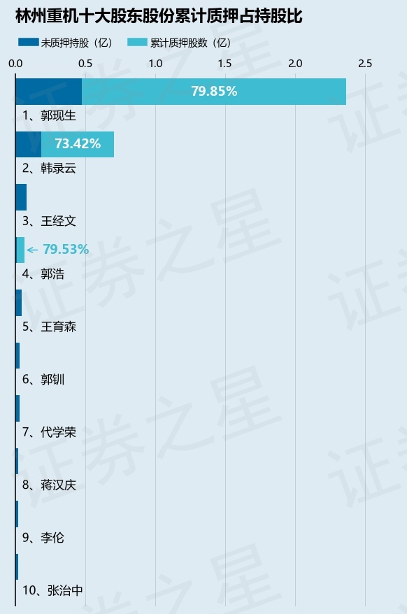 截止本公告日,股东郭现生已累计质押股份1.89亿股,占其持股总数的79.85%,股东韩录云已累计质押股份5180.0万股,占其持股总数的73.42%,股东郭浩已累计质押股份515.0万股,占其持股总数的79.53%。本次质押后林州重机十大股东的累计质押股份占持股比例(占持股比例的计算以公司最新一期财务报表公布的十大股东的持股总数为基准)见下图: