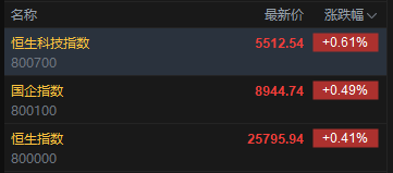 今日港股三大指数集体高开,恒指开盘涨0.41%,报25795.94点,恒科指涨0.61%,国企指数涨0.49%。盘面上,科网股涨多跌少,美团、哔哩哔哩涨超1%,网易跌近1%;黄金股普涨,灵宝黄金涨超2%;芯片股活跃,中芯国际涨超1%;今日四只新股上市,印象大红袍、华芢生物、明基医院、南华期货挂牌,集体低开,其中明基医院跌超30%。