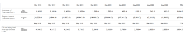 除了上述债务问题,甲骨文的资本配置策略在最近几个季度也发生了转变,这种转变既表明其灵活性恶化,也对现有股东不友好。多年来,该公司一直是其自身股票的净买家,这从下面的现金流量表中可以看出。历史上,公司回购的股份多于新发行的股份,导致流通股数量从大约10年前的43亿股减少至2025财年末的仅28亿股。