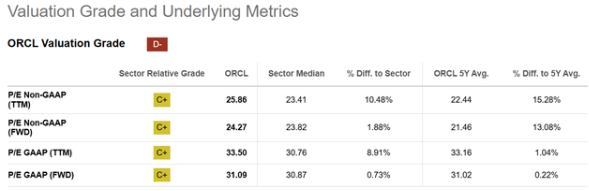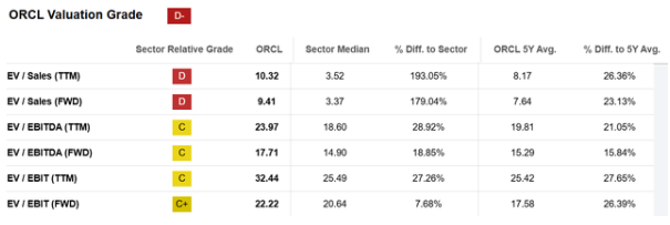 作为反映,下图说明了甲骨文经债务调整后的估值状况,特别是将其企业价值倍数与历史常态和行业基准进行比较。引用此图中的几个数字应足以阐明。如图所示,公司当前过去12个月的企业价值/息税折旧摊销前利润比率接近24倍,比其五年历史中位数19.8高出21%以上,也比行业中位数高出约29%,两者都表明估值风险比上述市盈率所暗示的更大。其他经债务调整的估值指标,如企业价值/收入和企业价值/息税前利润比率,也大致描绘了相同的情况。