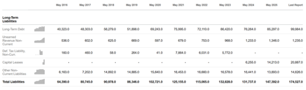 从下一张图表所示的第二财季更新后的资产负债表开始,这是甲骨文近期表现中第一个令人担忧的方面。根据下文详述的财务数据,其长期债务近年来显著增加,从约760亿美元增至目前的近1000亿美元。