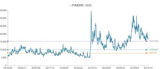 注:沪深交易所成交额彩色标记水平线分别为横轴统计日期范围内成交额25%、50%、75%分位数线,仅做静态展示使用,不含任何投资建议
