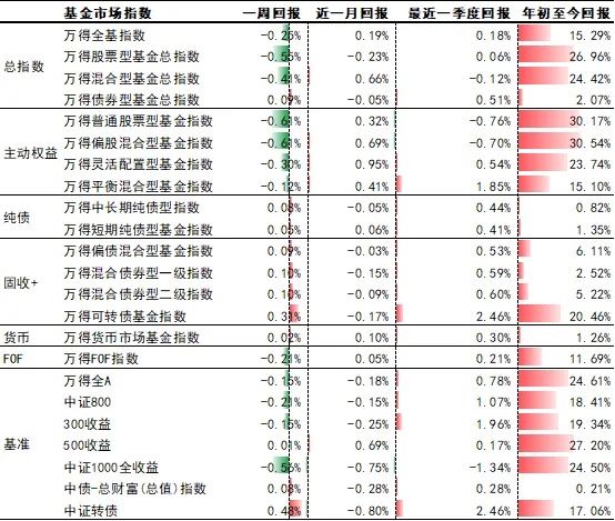 基金表现:上周万得全基指数下跌0.25%。其中,万得普通股票型基金指数下跌0.61%,万得偏股混合型基金指数下跌0.61%,万得债券型基金指数上涨0.09%。