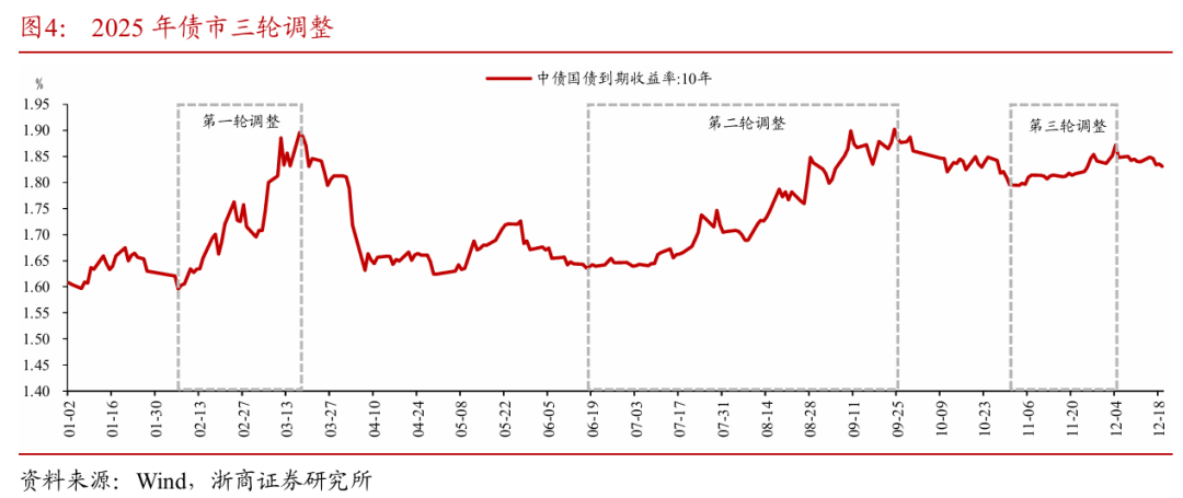 形态层面,不排除第三轮调整仍未结束的可能性。2025年10年国债收益率走势整体呈现出相对鲜明的双重顶特征,在1.90%点位附近具有较强支撑力量。从调整方式来看,即便在调整斜率相对更高的第一轮调整期间,调整也并非一蹴而就,期间存在5BP左右的阶段性回调窗口期,第二轮调整更是呈现出反复拉锯的调整方式。我们认为或不排除第三轮调整仍未结束的可能性,即走出类似第二轮调整的形态结构,10年国债收益率按照调整-小幅修复-再度调整的方式震荡上行。