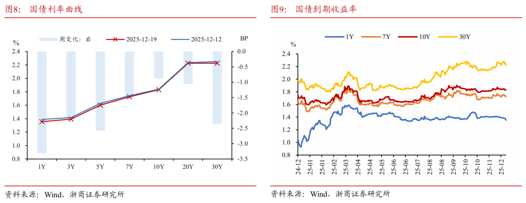 过去一周(2025年12月15日-2025年12月19日),10年国债收益率短暂冲高后持续回落。12月15日,现券收益率于午后冲高上行,债市整体延续下跌趋势。12月16日,权益走弱并未增强债市上涨动能,现券收益率出现行情分化,10年国债活跃券收益率下行而30年上行。12月17日,债市呈现底部企稳反弹,宽货币预期推动下现券收益率有所走低。12月18日,央行重启14天逆回购释放资金面呵护信号,现券收益率有所走低但尾盘出现跳水迹象。12月19日,宽货币预期交易再度升温,带动现券收益率震荡下行。截至收盘,10年国债活跃券收报1.8350%,30年国债活跃券收报2.2270%。