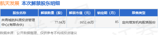 证券之星消息,根据市场公开信息整理,航天发展(000547)于12月22日将有77.04万股限售股份解禁,为公司定向增发机构配售股份,占公司总股本0.05%。(本次数据根据历史公告整理得出,实际情况以上市公司最新公告为准)本次解禁后,公司还有934.72万股限售股份,占总股本0.58%。具体如下图所示: