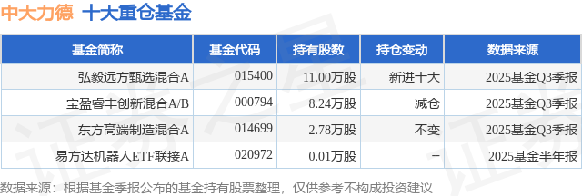 根据2025基金Q3季报公募基金重仓股数据,重仓该股的公募基金共3家,其中持有数量最多的公募基金为弘毅远方基金的弘毅远方甄选混合A。弘毅远方甄选混合A目前规模为0.17亿元,最新净值1.21(12月19日),较上一交易日上涨1.59%。该公募基金现任基金经理为马佳 王哲宇。马佳在任的基金产品包括:弘毅远方民企领先100ETF,管理时间为2022年9月6日至今,期间收益率为23.12%;弘毅远方久盈混合A,管理时间为2023年6月2日至今,期间收益率为2.12%;弘毅远方北证50成分指数A,管理时间为2025年12月10日至今,期间收益率为1.65%。王哲宇在任的基金产品包括:弘毅远方汽车产业升级混合A,管理时间为2024年7月30日至今,期间收益率为62.45%;