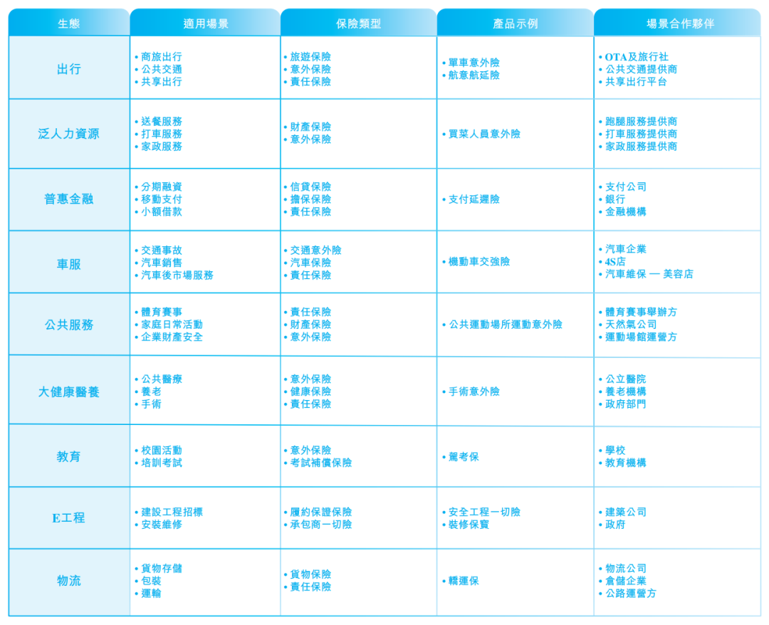白鸽在线的产品横跨例如出行、健康及公共服务等九种生态圈,确保采用有效方法来解决多个生态系统中各种场景的不同风险,而不是狭隘地专注于特定场景中的单一类型风险。公司已将业务组合扩展到以下九个生态系统: