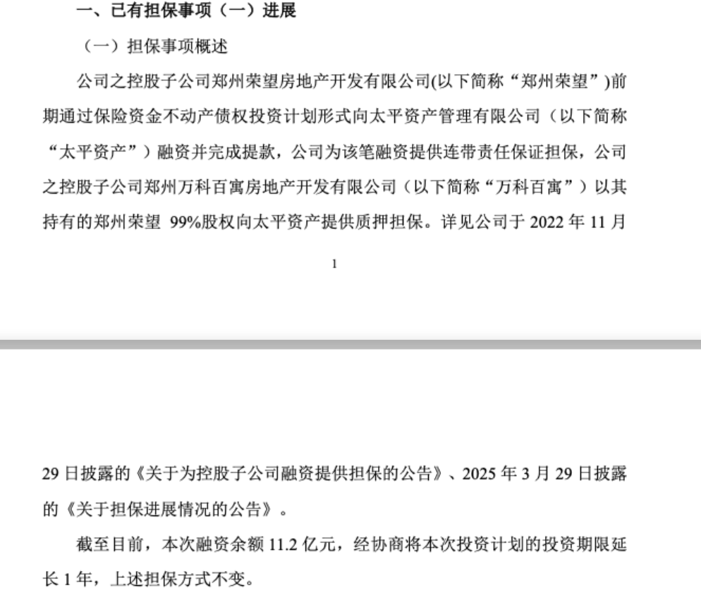 其中,万科控股子公司郑州荣望房地产开发有限公司(下称“郑州荣望”)前期通过保险资金不动产债权投资计划形式向太平资产融资并完成提款。截至目前,此次融资余额11.2亿元,经协商将本次投资计划的投资期限延长1年,担保方式不变。
