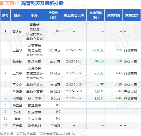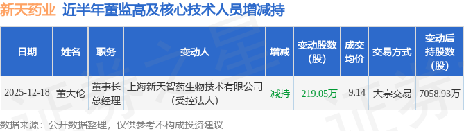 证券之星消息,根据12月22日市场公开信息、上市公司公告及交易所披露数据整理,新天药业(002873)最新董监高及相关人员股份变动情况:2025年12月18日公司董事长,总经理董大伦共减持公司股份219.05万股,占公司总股本为0.8974%。变动期间公司股价上涨3.59%,12月18日当日收盘报10.11元。