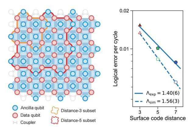 图 1. 左:随着码距增从 3( 橙色框内比特)增大到 5(红色框内比特)再到 7(所有彩色标注比特),右:逻辑错误率指数下降