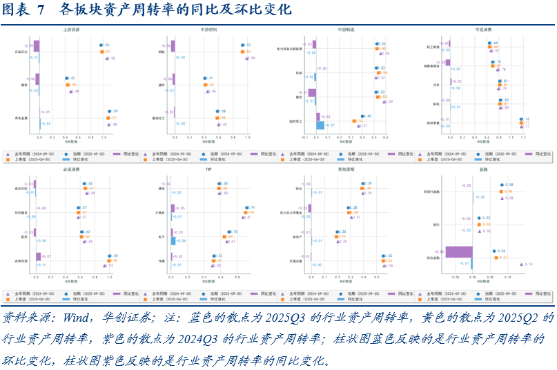 资产周转率衡量企业利用资产创造收入的效率,其变化反映了行业运营效率、需求状况和资产配置的变动。我们将中信一级行业划分为8个板块,然后对比了各板块细分行业在2025Q3的资产周转率的环比和同比变化,可以发现: